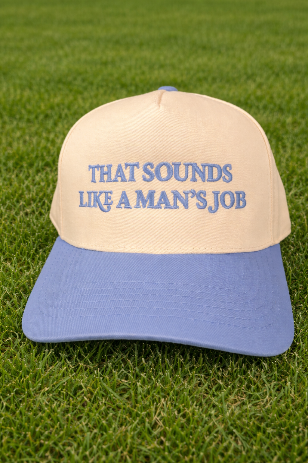 Hilarious and durable. This 100% cotton trucker features a five-panel build with an adjustable snapback for a secure fit. Available in two tone beige + blue with blue embroidery. Soft, breathable, and reinforced with quality stitching—perfect for any outfit or occasion.